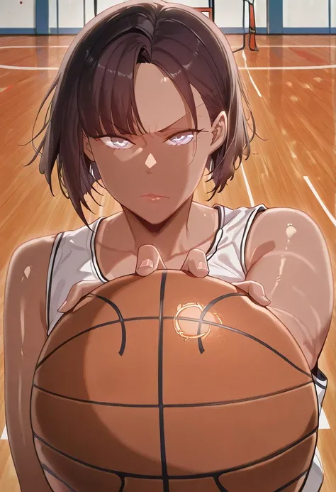 <lora:basketball-grip-illustriousxl-lora-nochekaiser:1>, basketball grip, solo, looking at viewer, shirt, holding, closed mouth, upper body, sleeveless, v-shaped eyebrows, ball, serious, sportswear, holding ball, basketball (object), basketball, basketball uniform,