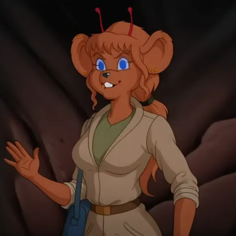HarleyBMfM, 1girl, solo, furry female, anthro, mouse, animal ears, ear piercing, red antennae, orange fur, orange hair, long hair, ponytail, bangs, blue eyes, black snout, teeth, incisors, large breast, thick thighs, mouse tail, beige jacket, rolled up sleeves, green shirt, belt, green pants, knee pads, pockets, boots, shoulder bag,