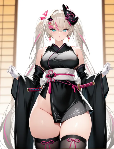 LiaPC, platinum hair, long twintails, bangs, hair between eyes, pink streaked hair, hairpins, hair ornament, pink ribbons, aqua eyes, earrings, medium breasts, bare shoulders, sleeveless, black collar, fishnet triangle top, two-tone top, black lace armlet, pink elbow gloves, fingerless gloves, black pleated skirt, pink lightning bolt print, thigh strap, garter straps, mismatched thighhighs, cross print pink thighhigh, asymmetrical legwear, black and pink legwear, pink trim platform boots, black lace-up boots