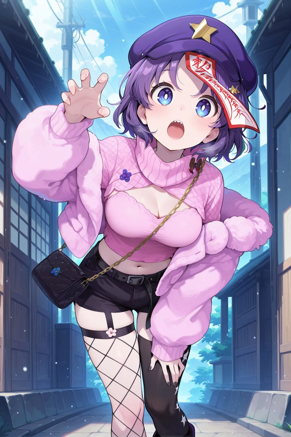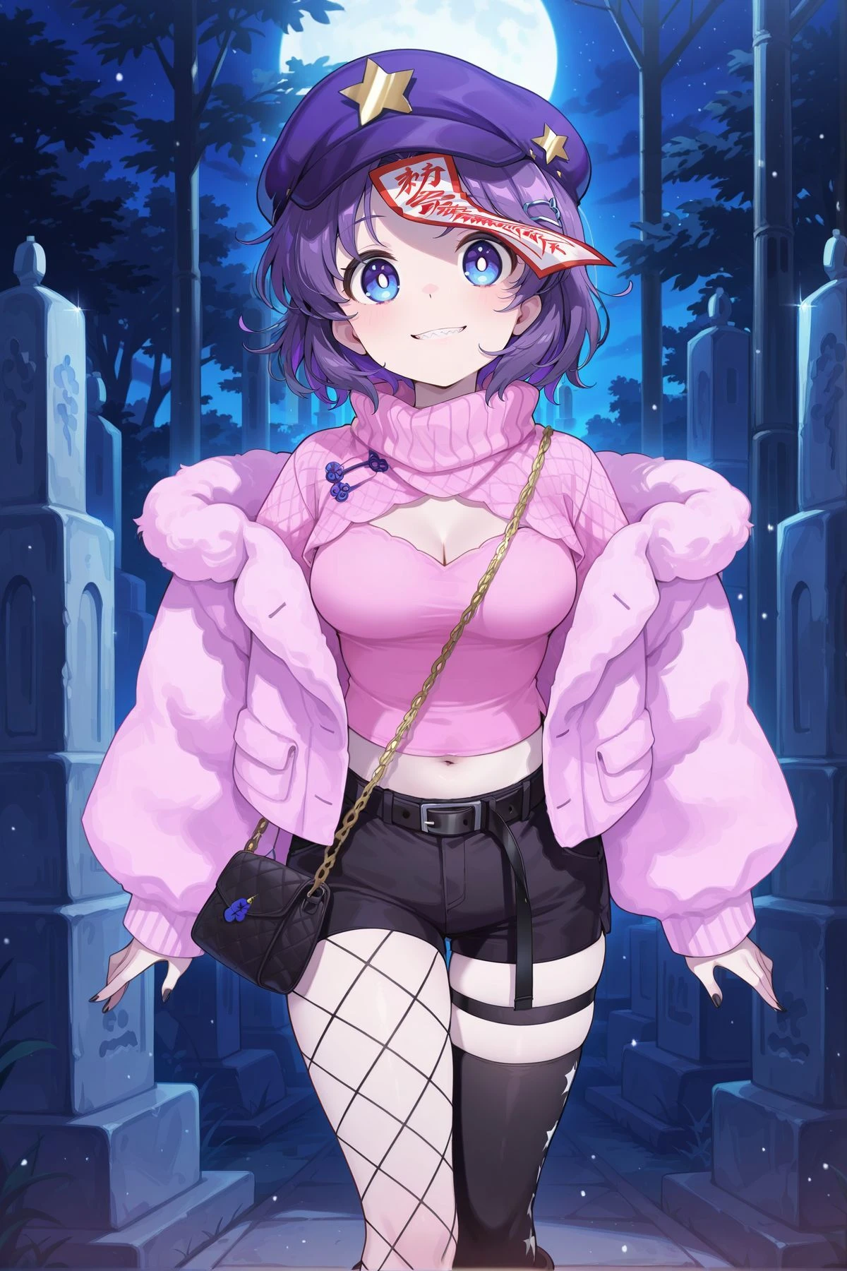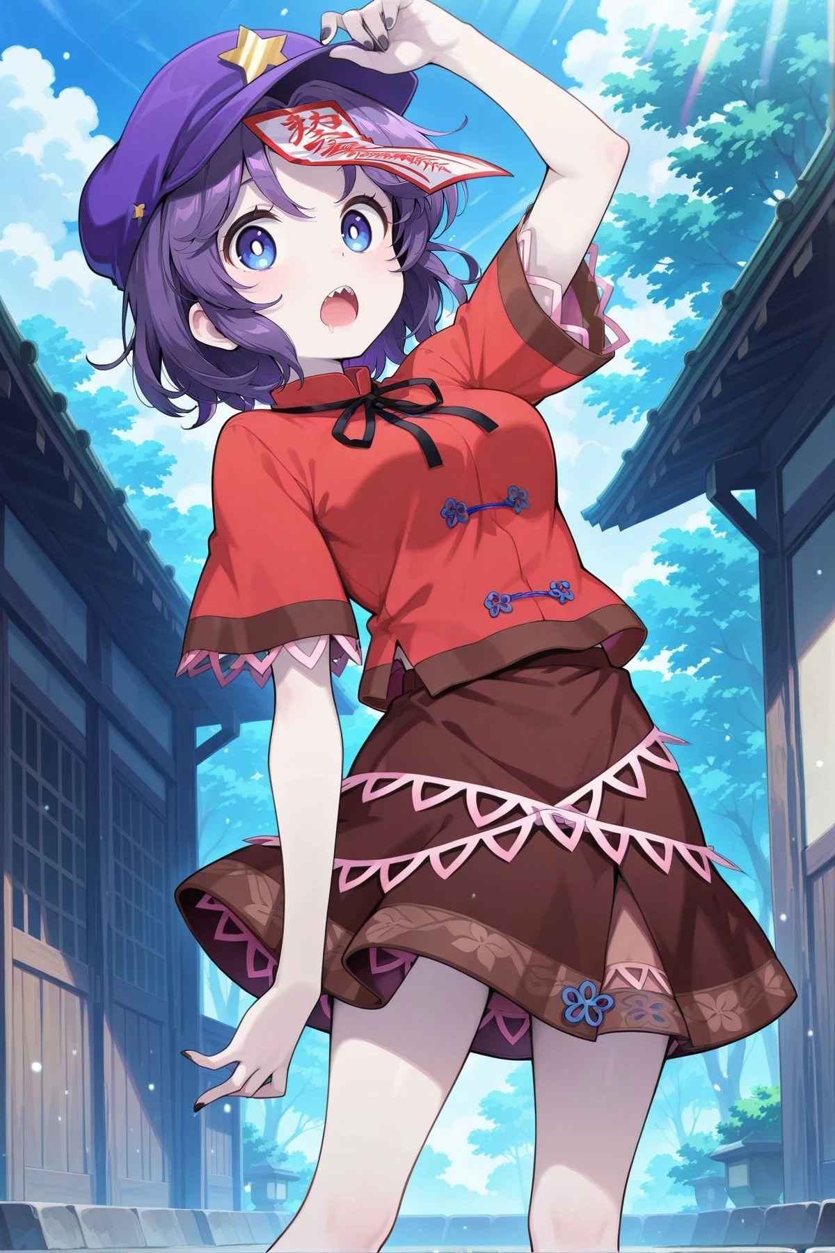 miyako yoshika, 1girl, solo, blue eyes, purple hair, short hair, sharp teeth, white pupils, bright pupils, pale skin, medium breasts,jiangshi, newsboy cap, purple hat, star hat ornament, ofuda on head, black neck ribbon, red shirt, short sleeves, brown skirt, black shoes,