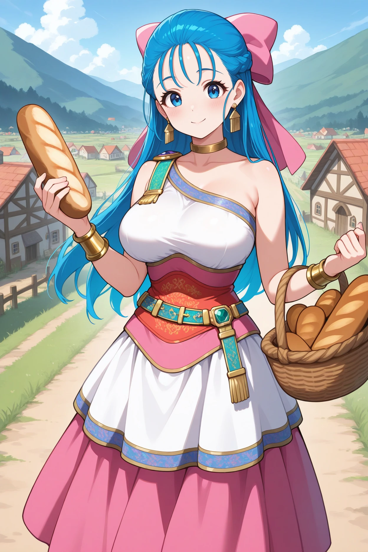 d5flo, blue hair, long hair, half updo, blue eyes, hair bow, pink bow, large breastsgold choker, earrings, sleeveless dress, long dress, two-tone dress, belt, pink corset, gold bracelets