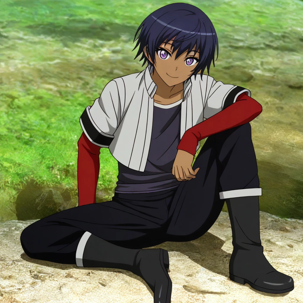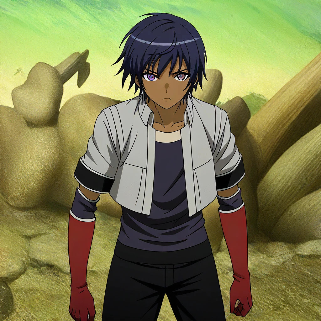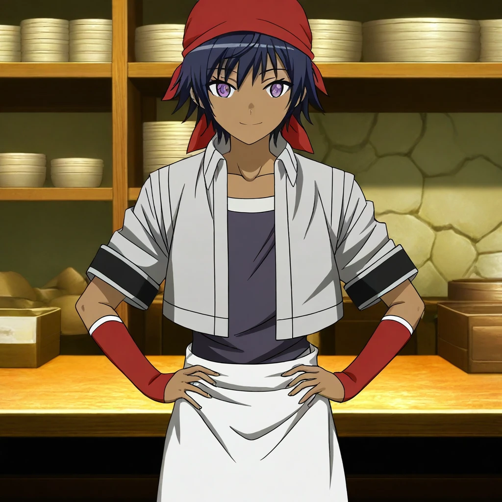RickElwoodbrown skin, short hair, dark-indigo hair, purple eyes,silver crop-top jacket, short-sleeves, dark-blue undershirt, red forearm-sleeves, black pantsblack suspended apron, red head bandana