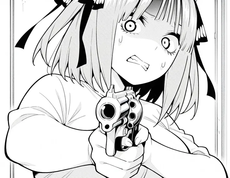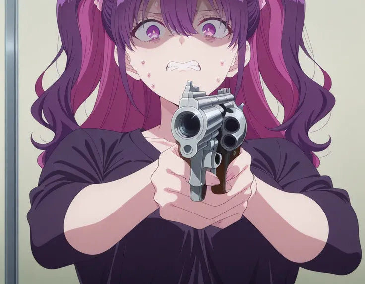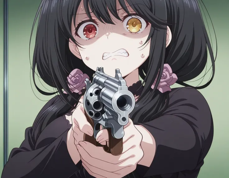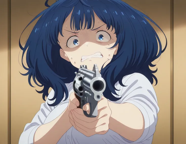<lora:misa-guido-okay-narancia-illustriousxl-lora-nochekaiser:1>, misa guido okay narancia, solo, looking at viewer, holding, weapon, holding weapon, gun, parody, holding gun, handgun, aiming, nervous, teeth, shaded face, clenched teeth, revolver,