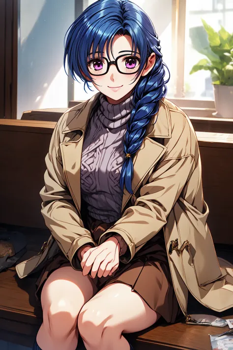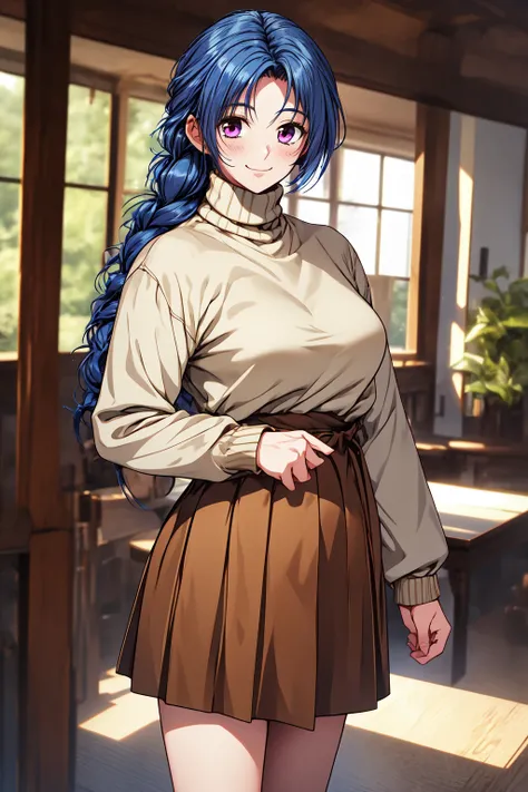 doukoku_kosuzu, purple eyes, blue hair, long hair, single braid, maid headdress, maid, maid apron, puffy sleeves, long sleeves, long skirt,