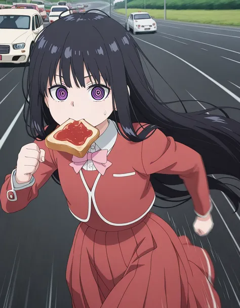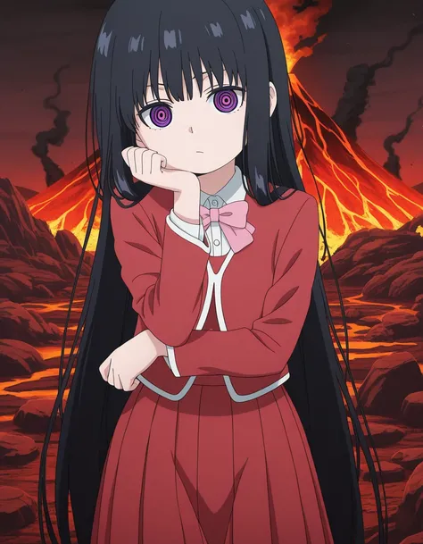 oto adashino, long hair, bangs, black hair, very long hair, purple eyes, ringed eyes, anime screencapskirt, shirt, long sleeves, bow, jacket, white shirt, bowtie, red skirt, pink bow, red jacket, pink bowtie,