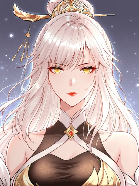 1 girl, solo, long hair, white hair, hair bun, side bangs, golden eyes, ornamental hairpin, chinese outfit, white and black dress, sleeveless top, detached sleeves, high slit skirt, black thigh-high stockings, golden decorations, gold-trimmed fabric, translucent white drape, asymmetric outfit, dangling ornaments, gold waist ornament, gold pattern stockings,