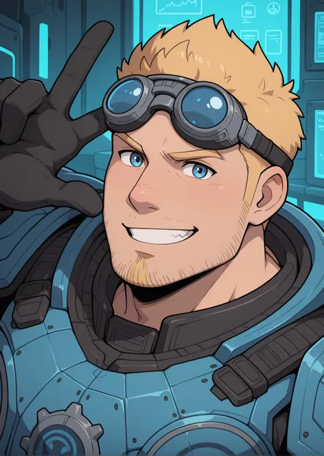 damonbaird1boy, mature male, male focus, muscular, bara, blonde hair, short spiky hair, messy hair, white background, beard stubble, goatee, animification, looking at viewer, close shot, grumpy, goggles on head, wrinkles, power armor, pauldrons, grey belt, black pouch, black pants, black fingerless gloves, pose, blue eyes