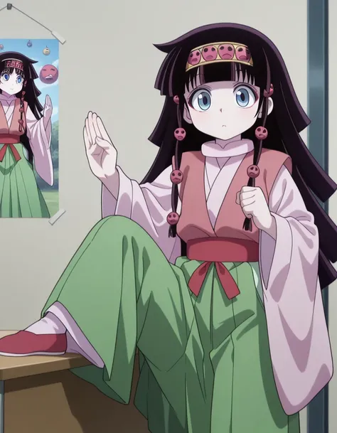 hxh alluka, long hair, blue eyes, black hair, hair ornament, hairband, blunt bangs, anime screencap,long sleeves, japanese clothes, wide sleeves, kimono, sash, hakama, green hakama, multicolored clothes
