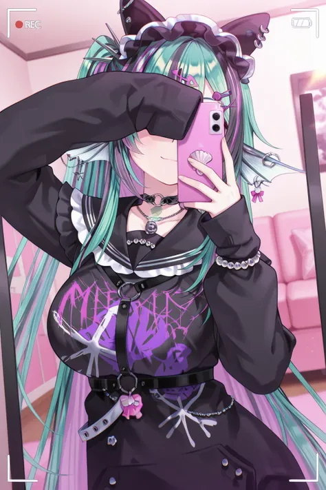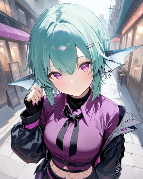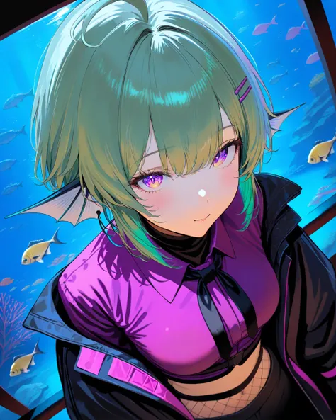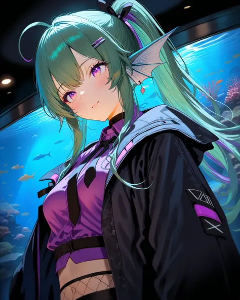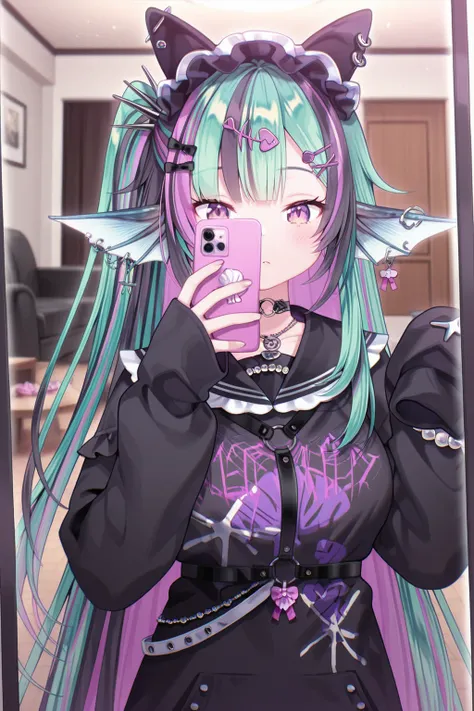 FinanaRyuguNijisanjipurple eyes, jirai kei, hair bow, shell hair ornament, piercing, hairband, fish hair ornament, heart o-ring, hairclip, x hair ornament, earrings, neck tattoo, o-ring choker, necklace, black sailor collar, long sleeves, sleeves past wrists, bracelet, black dress, chest harness, black belt, jewelry, bandaid on leg, thigh strap, bandaid, loose socks, black footwear