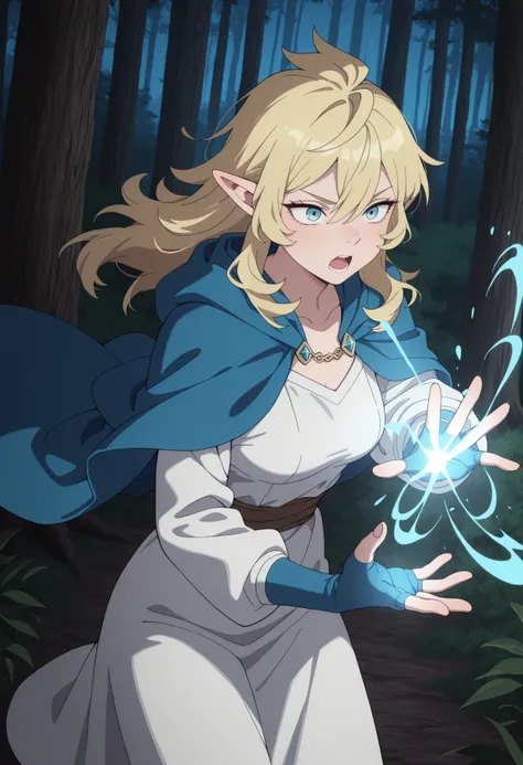 KJOfionil, blonde hair, light blue eyes, hair between eyes, pointy ears, long hair,