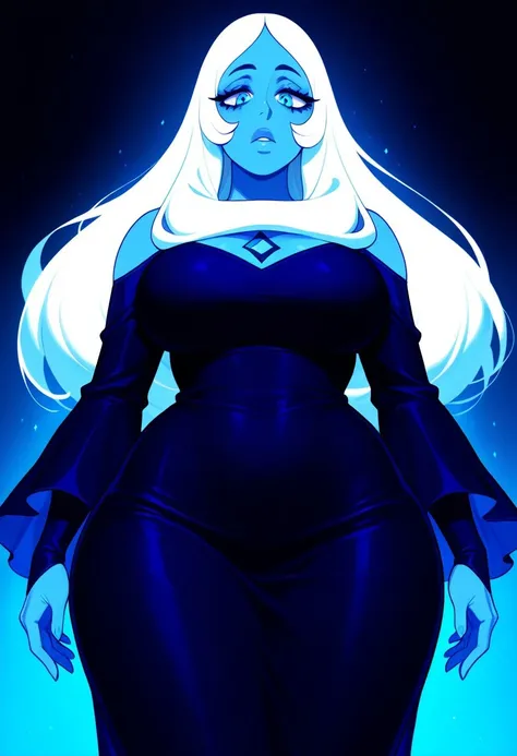 bluediamondILL, long hair, blue skin, white hair, blue eyes, long blue dress,cartoon, steven universe