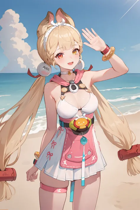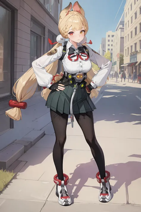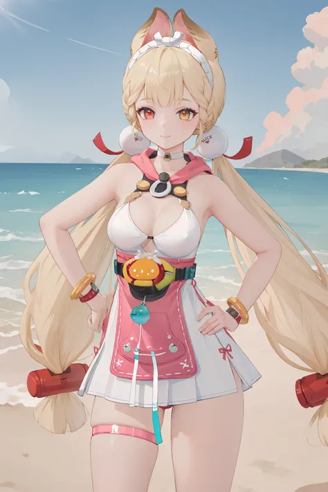alice thymefieldheterochromia, braided bangs, twintails, hair bobbles, white collared shirt, ribbon-trimmed sleeves, two-tone bowtie, chest harness, fingerless gloves, utility belt, high-waist pleated skirt, print pantyhose, high topsheterochromia, braided bangs, twintails, hair bobbles, white hairband, white choker, pink hood, dress swimsuit, utility belt, bracelet, wristwatch, thigh strap, flip-flops