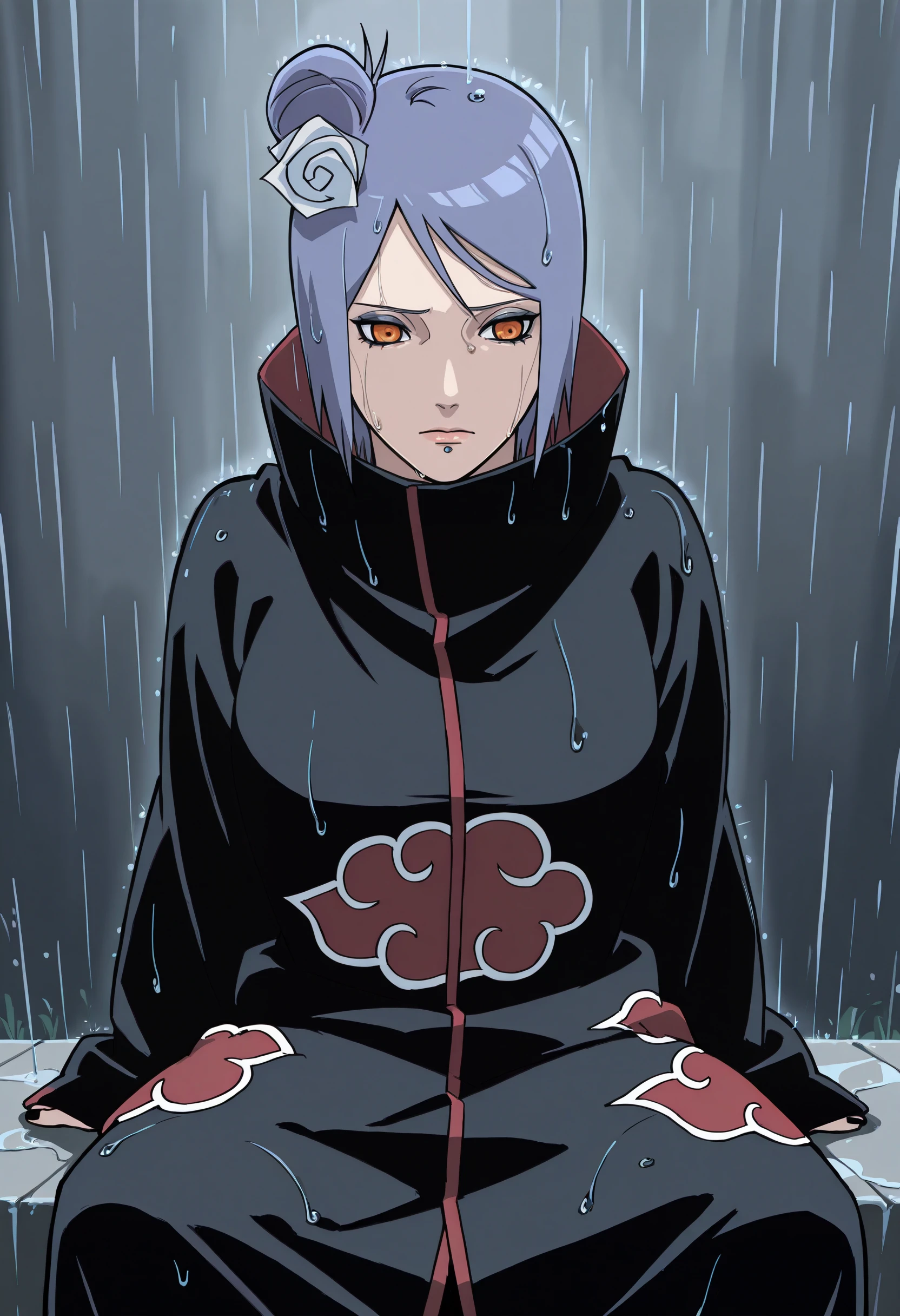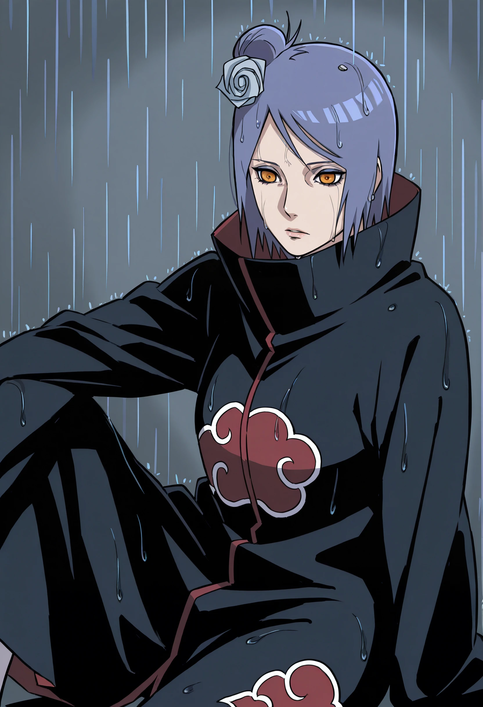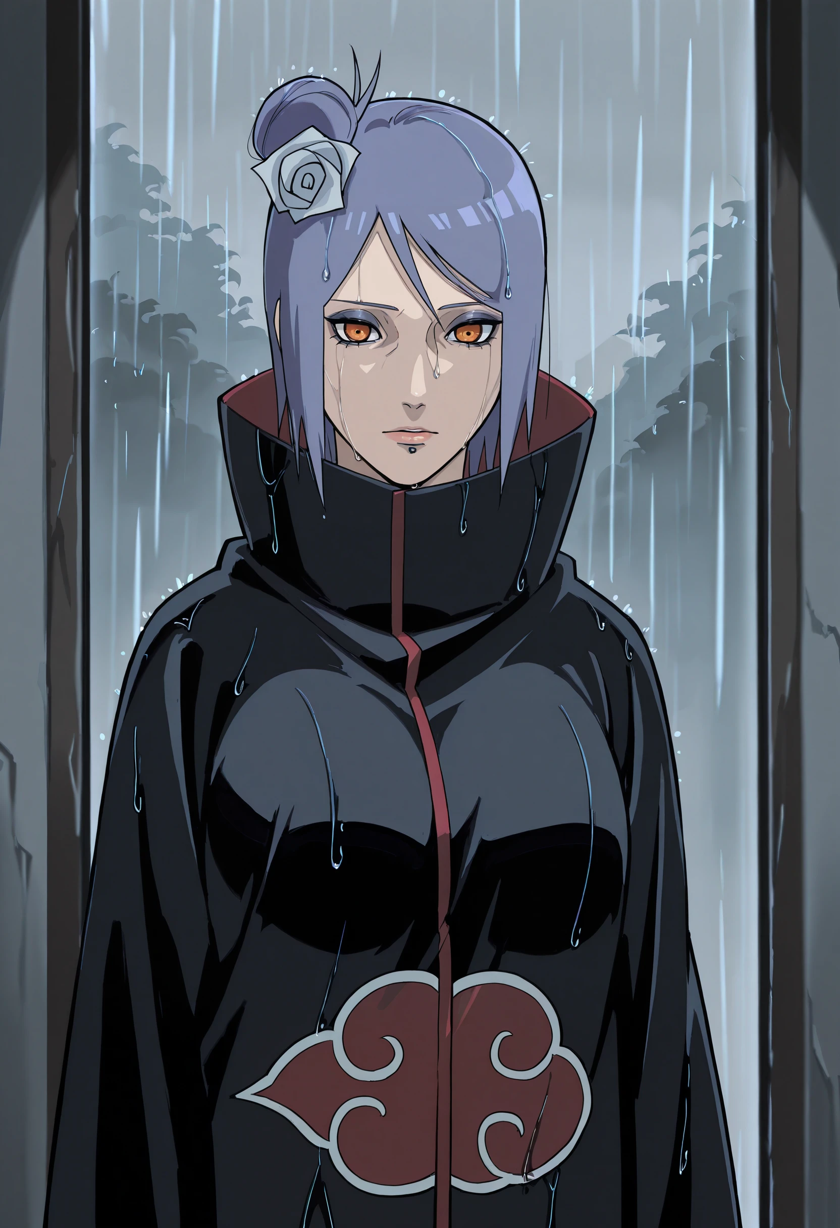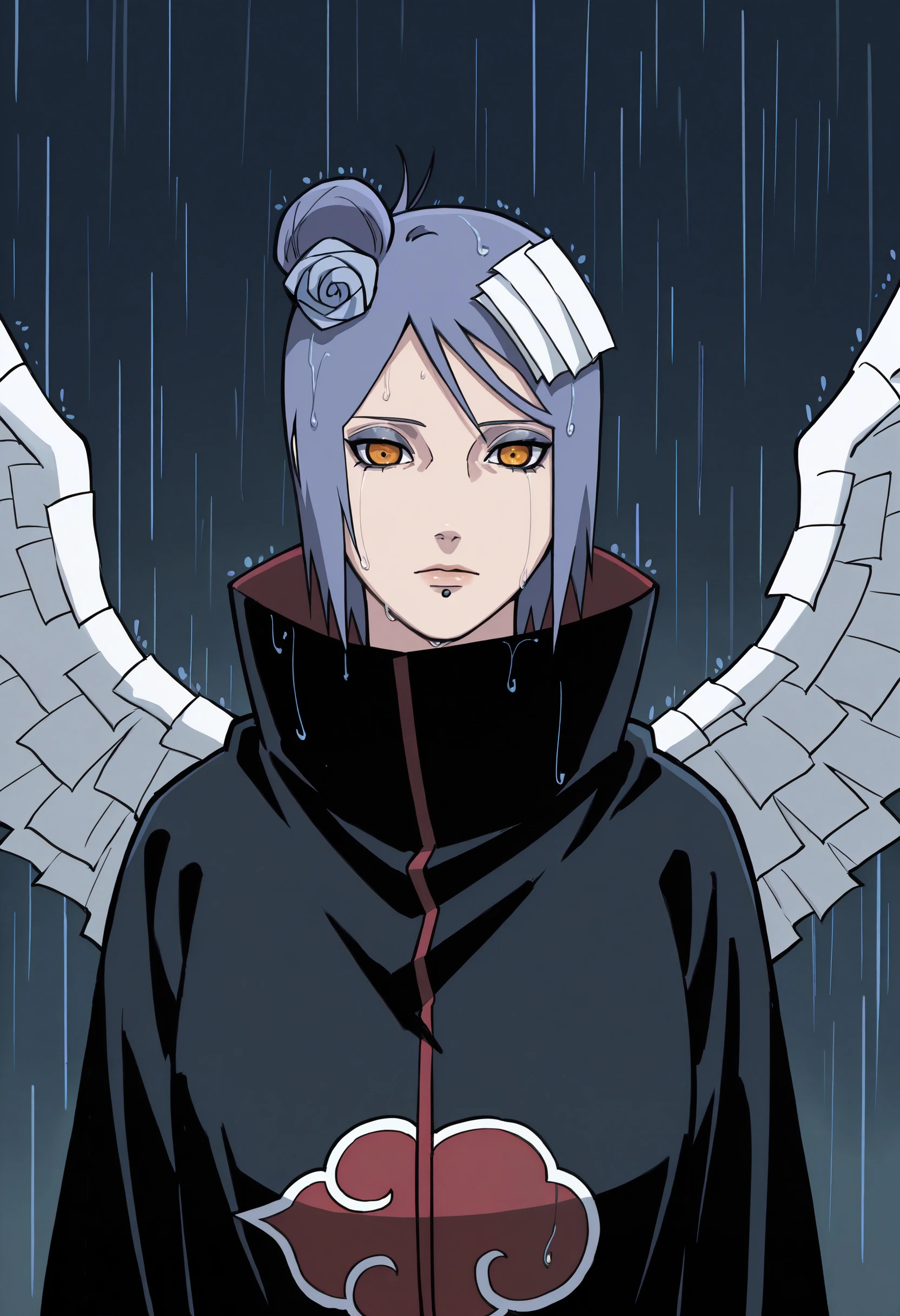 orange eyes, makeup, piercing, purple hair, konan_(naruto), paper rose hair ornament, single hair bun, short hair, paper wings, paperakatsuki_uniform, long jacket, cloak, high collarblue shirt, black short shorts, cleavage cutout, bare shoulders
