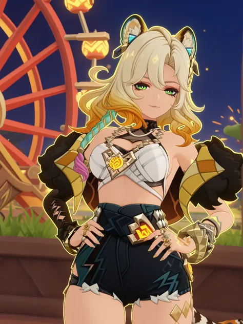 xilonen, xilonen (genshin impact), long hair, blonde hair, hair ornament, animal ears, green eyes, tail, multicolored hair, gradient hair, tiger ears, tiger tail, tiger girl, mature female, large breasts, 3djewelry, bare shoulders, jacket, shorts, off shoulder, bracelet, fur trim, short shorts, sideboob, black shorts, ring, denim shorts,