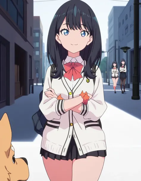 rikka takarada, takarada rikka, black hair, blue eyes, long hair, orange scrunchie, scrunchie, wrist scrunchie, mature female, medium breasts, anime screencap,black skirt, bow, bowtie, buttons, cardigan, collared shirt, long sleeves, microskirt, pleated skirt, red bow, red bowtie, school uniform, shirt, skirt, thighs, white cardigan, white shirt,