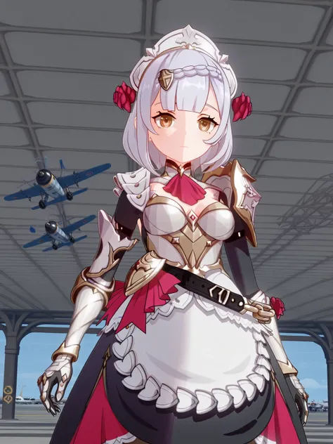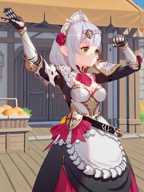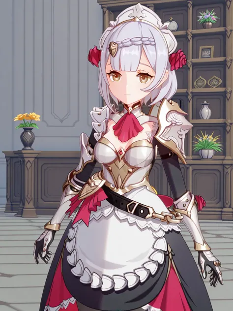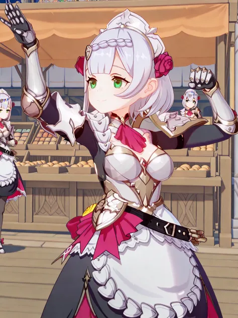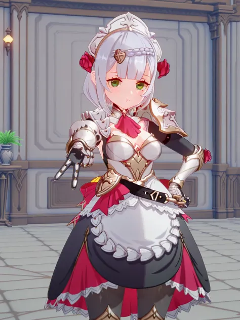 noelle, noelle (genshin impact), braid, flower, hair flower, hair ornament, short hair, silver hair, green eyes, mature female, medium breasts, 3dapron, armor, ascot, black pantyhose, black skirt, dress, gauntlets, gold trim, headdress, long sleeves, maid, maid apron, maid headdress, pantyhose, pauldrons, shoulder armor, skirt, strap,