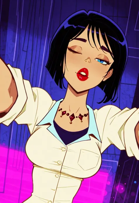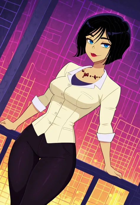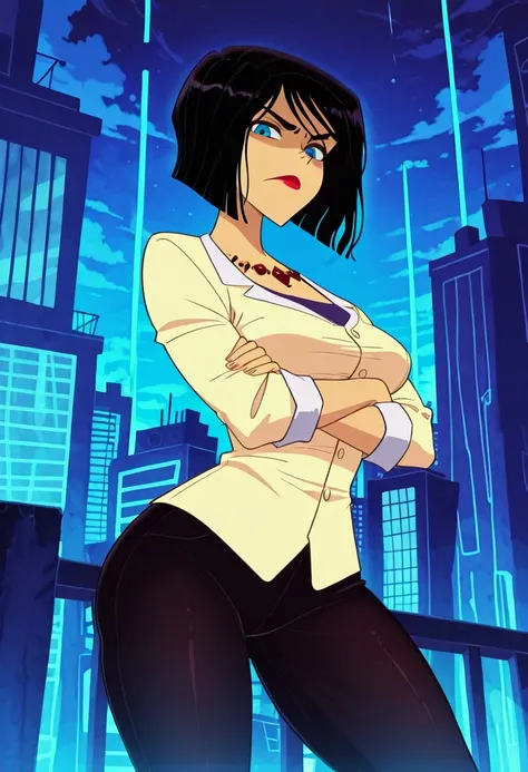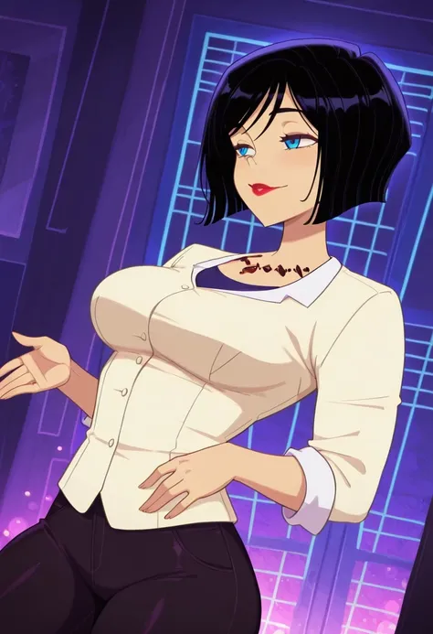 ParkerKovakPP, 1girl, solo, black hair, short hair, bangs, bob cut, blue eyes, nose, red lipstick, necklace, beige jacket, blue shirt, large breast, thick thighs, black pants, buttons, rolled-up sleeves, white collar,