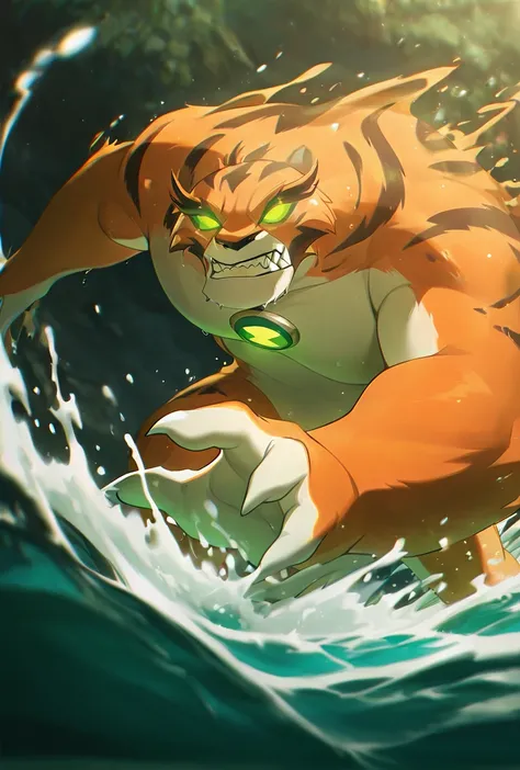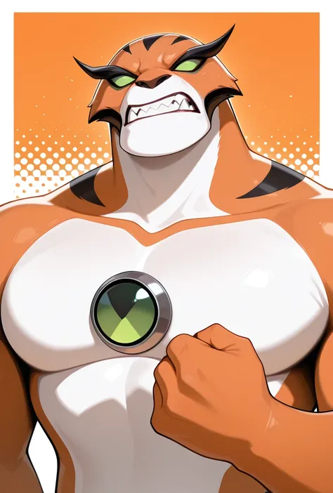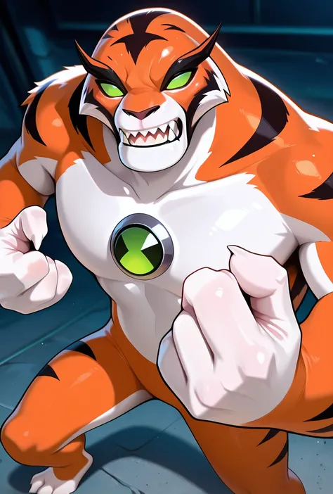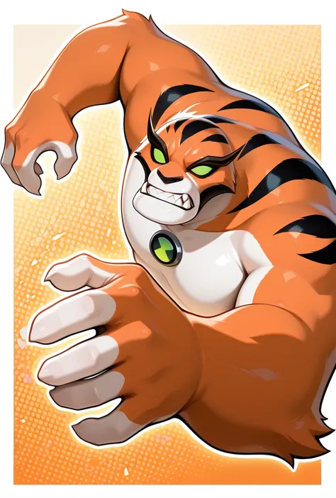 rath, furry, 1boy, green eyes, green sclera, solo, no humans, tiger strips , fangs, orange fur, sharp teeth, big arms, no pupils, big body, black eyebrows, angry,, white fingerschaquetrix, rath, furry, 1girl, pink eyes, pink sclera, solo, no humans, tiger strips , fangs, orange fur, sharp teeth, big arms, no pupils, thick big black eyebrows, round head, female lucha libre suit, wrestling clothes,, sleeveless,, curvy, black suit, pink lines, midriff,,, messy hair, hair, orange hair, white hair strips, multicolored hair, orange and white and black hair, , black shorts,