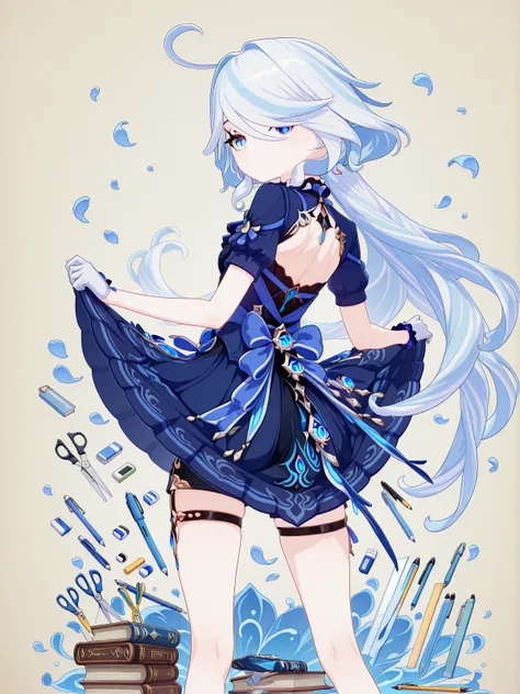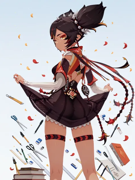 <lora:senjougaharahitagi-skirt-lift-pose-illustriousxl-lora-nochekaiser:1>, senjougaharahitagi skirt lift pose, solo, skirt, looking back, from behind, clothes lift, book, petals, skirt lift, skirt hold, pen, pencil, scissors, eraser, mechanical pencil, ruler, boxcutter, impossible storage,
