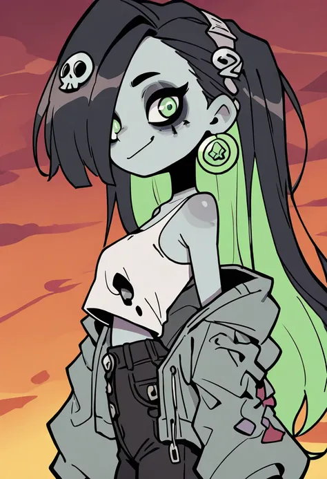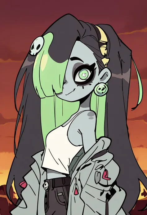 zzCadavera, green eyes, grey skin, hair over one eye, black hair, colored inner hair, green hair, hair ornament, long hair, multicolored hair, skull hair ornament, two-tone hair, zombie,zzCadavera, green eyes, grey skin, hair over one eye, black hair, colored inner hair, green hair, hair ornament, long hair, multicolored hair, skull hair ornament, two-tone hair, zombie, piercing, jacket, tank top, torn clothes, black pants, denim,