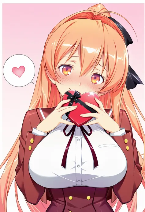m1kam1_ak1ra, long hair, ponytail, orange hair, orange eyes, hair ribbonschool uniform, neck ribbon, red jacket, pleated skirt, long sleeves, framed breasts, zettai ryouiki, black thighhighsribbed black sweater, turtleneck, untucked, puffy short sleeves, white skirt, frilled skirt, mini skirt, pantyhose, strap between breasts, bracelet, shoulder bag, black newsboy hat, pom pom (hat), pendantlarge breasts