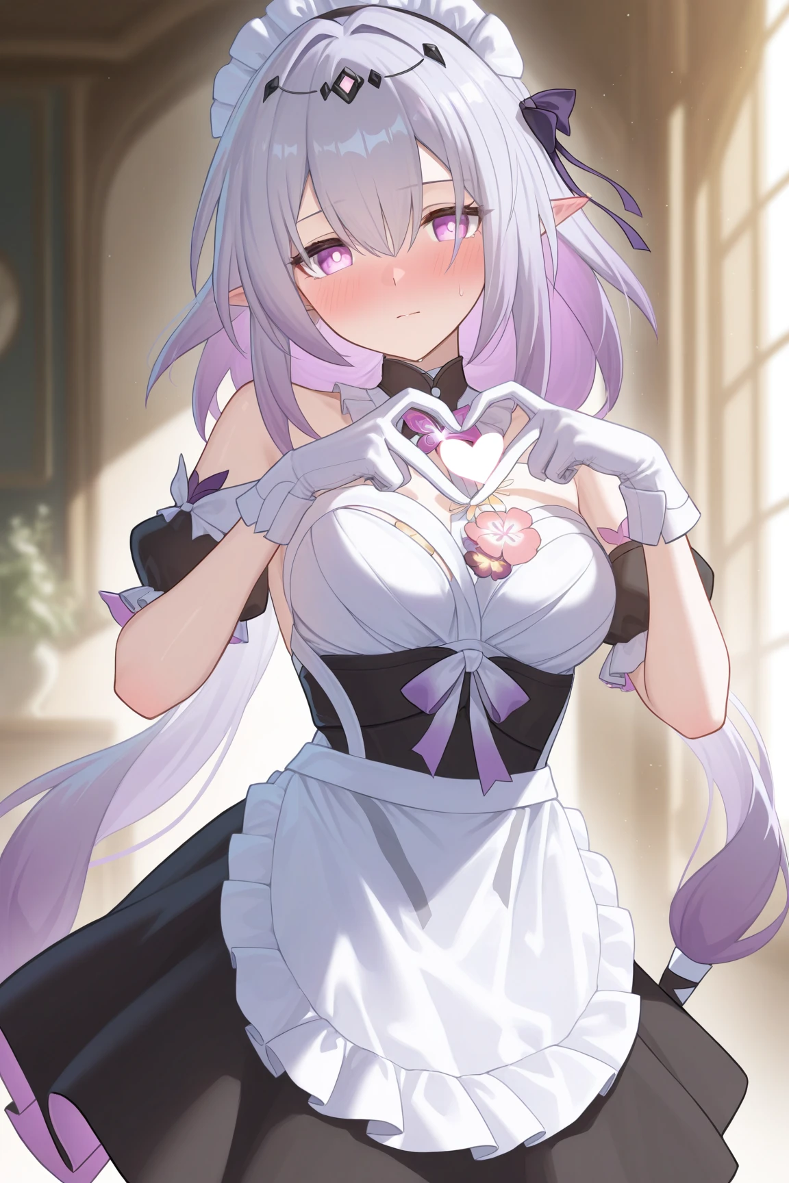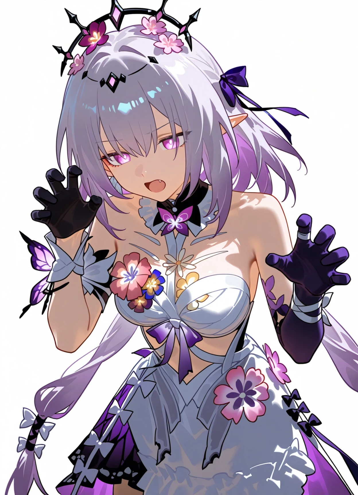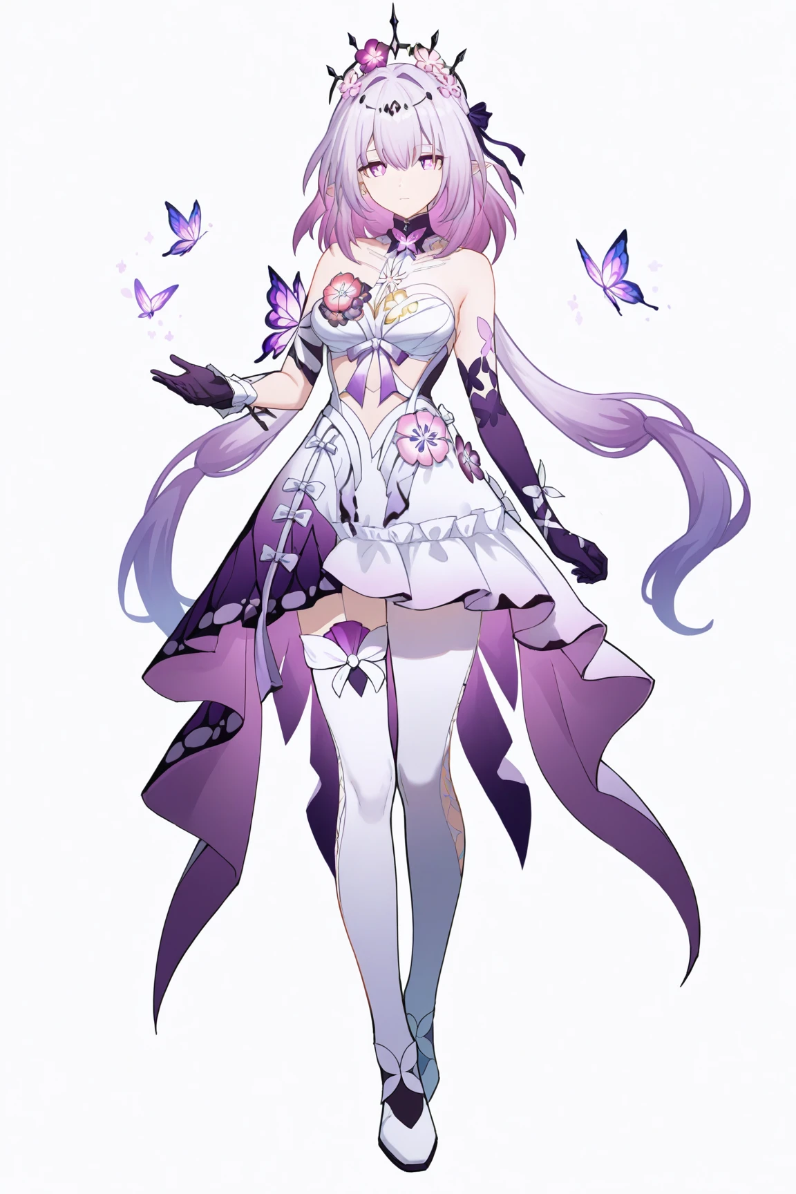 castorice \(honkai star rail\), 1girl, solo, butterfly, dress, breasts, white dress, purple eyes, purple hair, pointy ears, multicolored hair, hair ornament, tiara, pink hair, colored inner hair,flower,