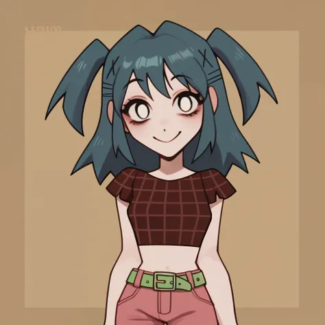 two side up, pink pants, green belt, burgundy checkered crop top, bare shoulders