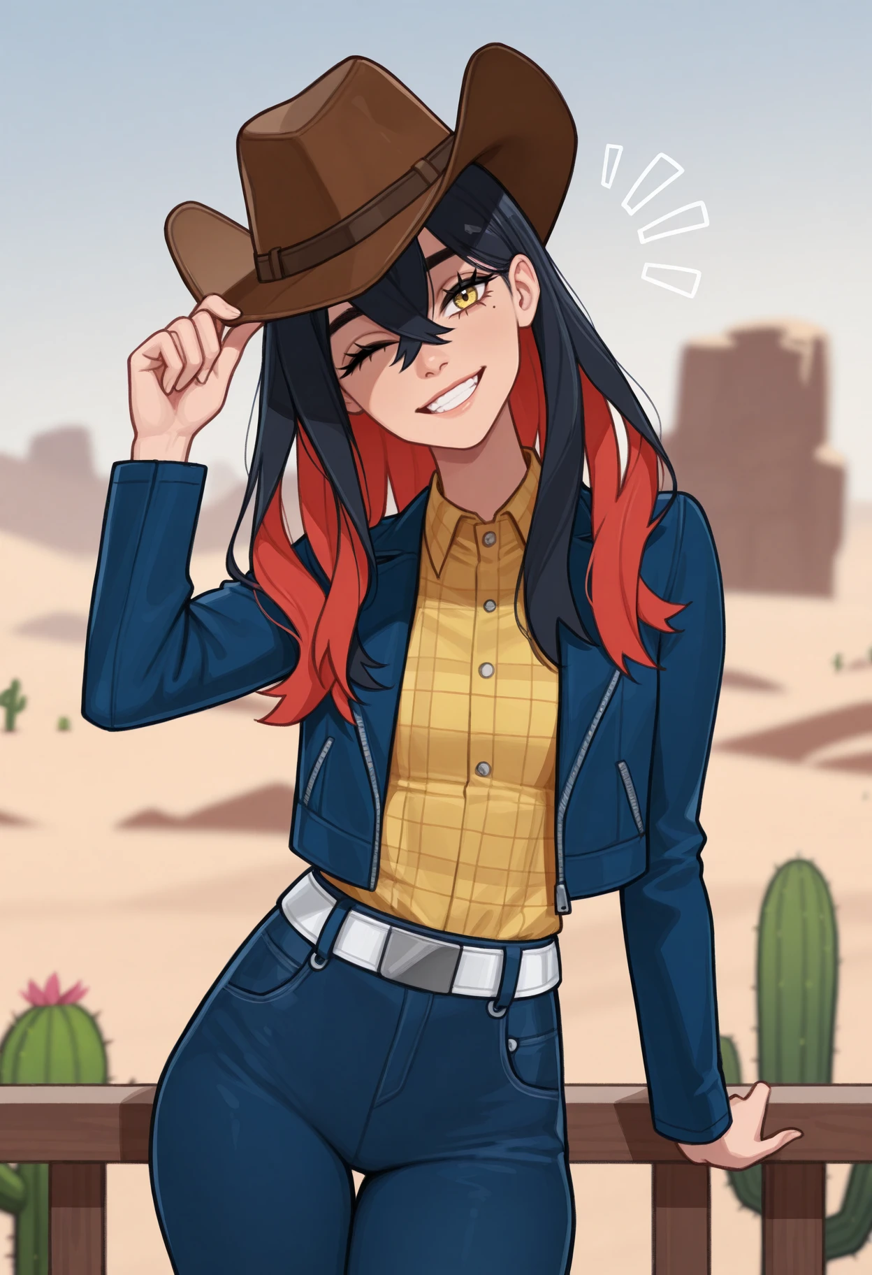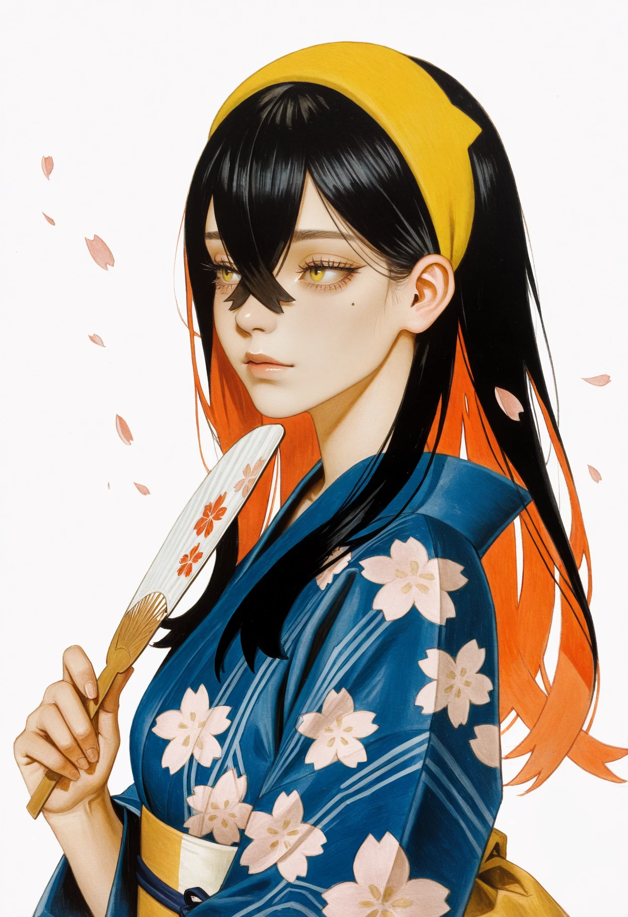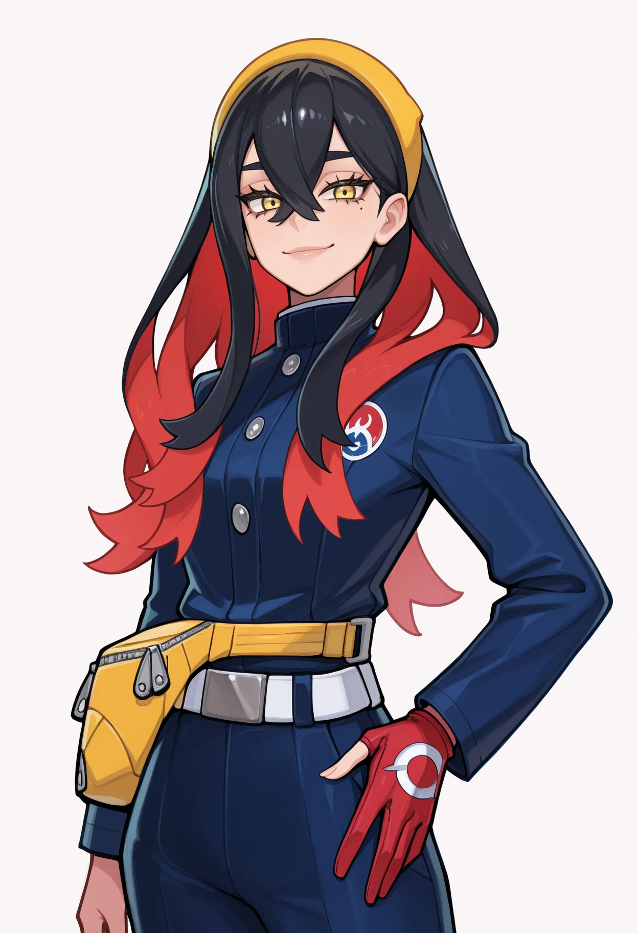 eniracblack hair, long hair, crossed bangs, hair between eyes, yellow eyes, eyelashes, yellow hairband, mole under eyeblue jacket, buttons, long sleeves, blue pants, white belt, belt buckle, yellow bag, fanny pack, red gloves, single glove, partially fingerless glovescolored inner hair