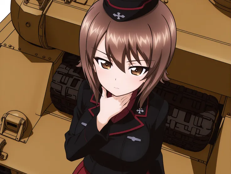 maho,short hairm_seifuku,kuromorimine school uniform,black collar,grey shirt,black skirt,black socks,black shoes,m_pg,kuromorimine military uniformm_hat,