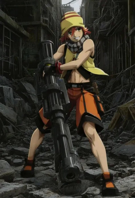 Kouta Fujiki, red-orange hair, brown eyes, yellow beanie with orange stripes, gray striped scarf, yellow open vest, single button, black undershirt, sleeveless, midriff, black fingerless gloves, red wrist brace, belt, black and orange shorts, black and orange shoes