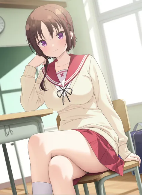 hagino chiaki, hinako note, brown hair, short hair with long locks, purple eyes, sidelocks, asymmetrical hair, medium breasts, x hair ornament, hairclipschool uniform,serafuku,red sailor collar,neck ribbon,yellow sweater,red skirt,pleated skirt,white sockswhite bikini,halterneck,front-tie bikini top,side-tie bikini bottomblack buruma,red jacket,track jacket