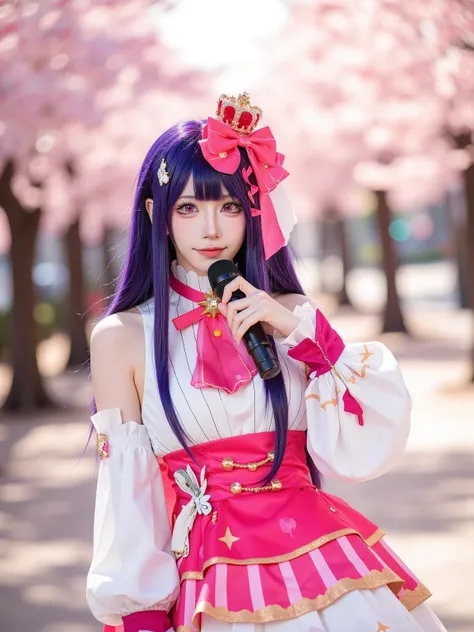 A realistic photo of a tall and slender beautiful young woman in cyb-hoshinoai cosplay costume. She is also wearing mismatched legwear and pink high heels. She has purple hair with mini crown and hair bow.
