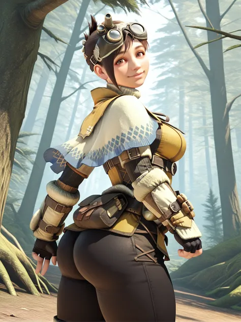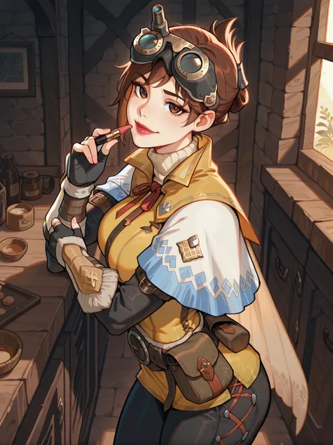 TheHandlerXL,,goggles on head, short hair, brown hair, brown eyes,,turtleneck, yellow tunic, capelet, fingerless gloves, arm guards, black pants, belt, belt pouch,,