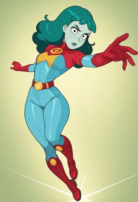 planetinaILL, green hair, green lips, long hair, green skin, gloves red, blue bodysuit, red footwear, beltcartoon, rick and morty