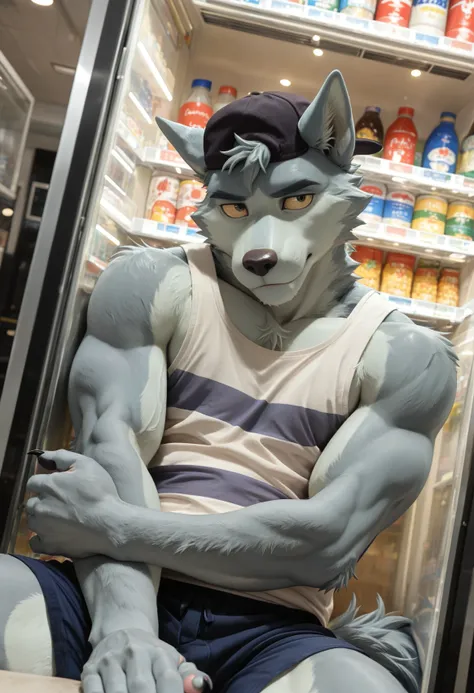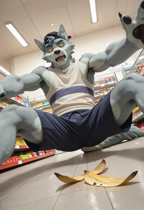 w0lf_wbbw0lf_wbb, male focus, furry, furry male, 1boy, animal ears, solo, bara, wolf ears, wolf boy, wolf tail, short hair, body fur, black cap, white tank top, shorts, looking at viewer, yellow sclera, claws