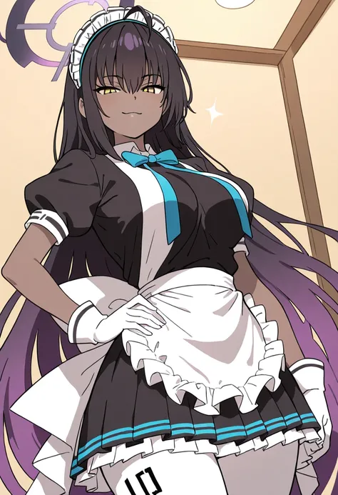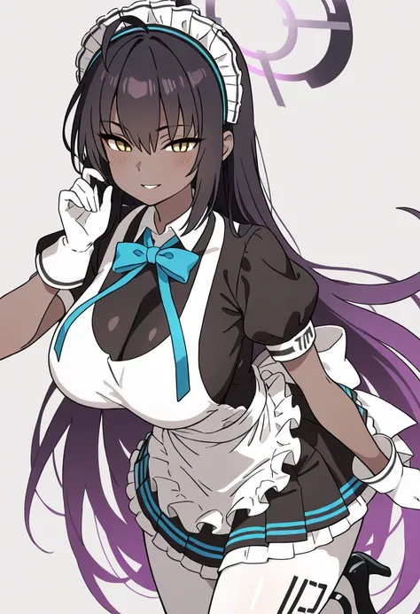 zzKarin, yellow eyes, hair between eyes, ahoge, black hair, gradient hair, long hair, multicolored hair, purple hair, dark skin, purple halo,zzKarin, yellow eyes, hair between eyes, ahoge, black hair, gradient hair, long hair, multicolored hair, purple hair, dark skin, purple halo, blue bow, maid headdress, puffy short sleeves, white gloves, white pantyhose, black footwear, bowtie, black dress, frills, high heels, maid apron,