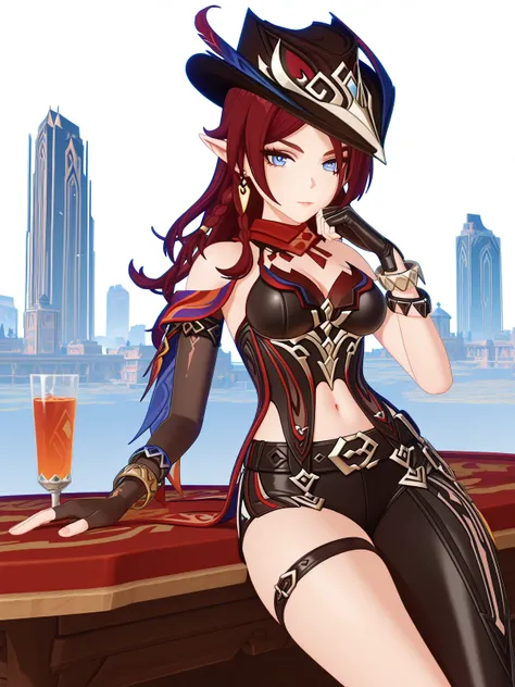 chasca, chasca (genshin impactt), long hair, blue eyes, braid, red hair, pointy ears, elf, mature female, medium breasts, 3dgloves, hat, navel, cleavage, jewelry, bare shoulders, earrings, shorts, black gloves, belt, fingerless gloves, scarf, bracelet, black headwear, thigh strap, single thighhigh, red scarf, hat feather, asymmetrical clothes