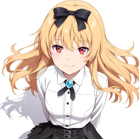 yue(arifureta), defoutfit, 1girl, blonde hair, thighhighs, red eyes, skirt, long hair, shirt, black skirt, black thighhighs, long sleeves