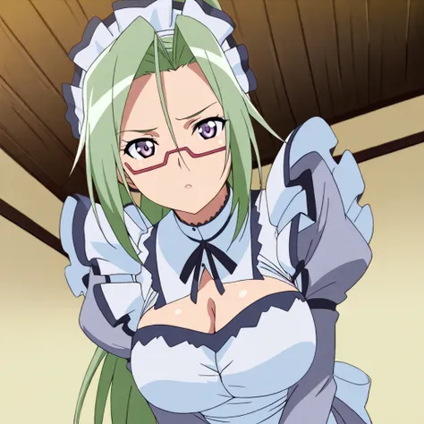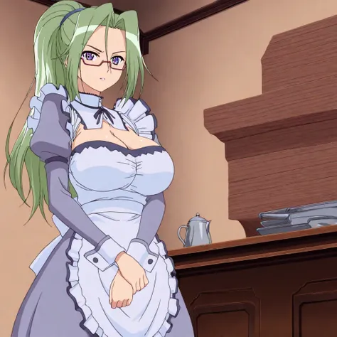 mitsukihanyuu, green hair, ponytail, purple eyes, glassesmaid,cleavage,apron