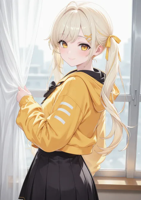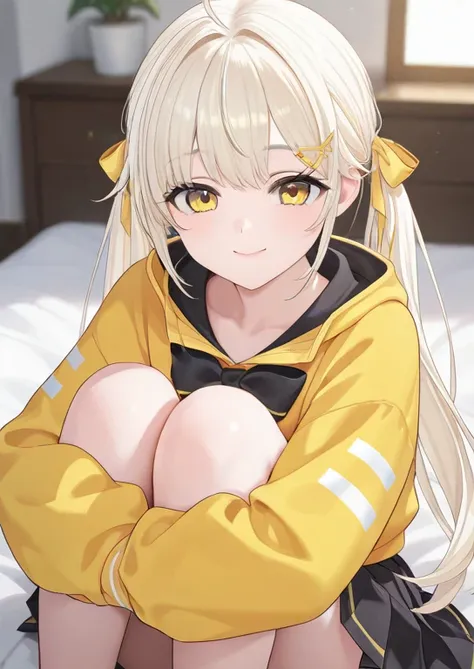 Kuiki, light blonde hair, long hair, twin tails, yellow hair ribbons, yellow eyes, pale skin,yellow cropped sailor hoodie, black bow, black pleated skirt, white asymmetrical thigh-high socks,black boots