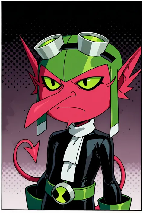 juryrigg, red skin, 1boy, green eyes, goggles, goggles on head, demon tail, green gloves, white scarf, black bodysuit, green belt, , long nosechaquetrix, juryrigg, red skin, 1girl, white hair, blonde hair, pink eyes, goggles, goggles on head, demon tail, pink gloves, pink scarf, black bodysuit, pink belt, breasts, pink aviator hat, pointy nose, twintails,