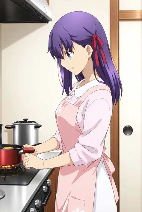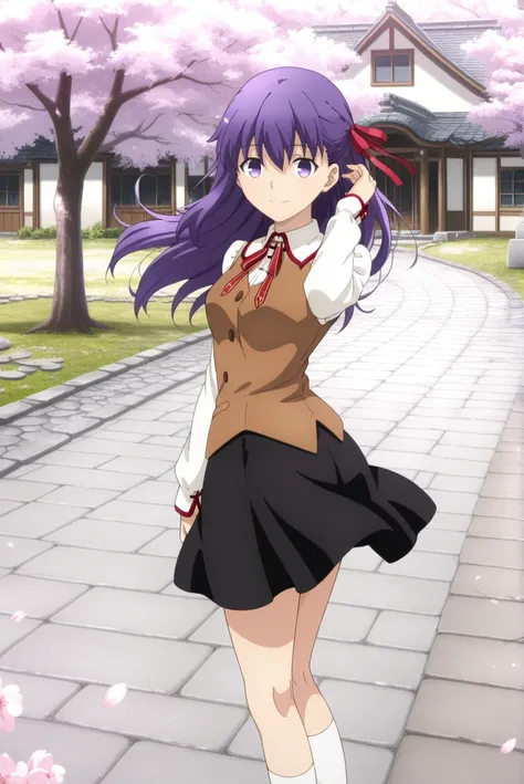 <lora:SakuraMatou-IL-v1-08:1.0>, ChopioSakuraMatou, long hair, purple hair, hair between eyes, purple eyes, no pupils, red ribbon, hair ribbon, looking at viewer, anime coloring,outfit_1, collared shirt, white collar, red neck ribbon, brown vest, long sleeves, buttons, black skirt, medium skirt, white socks, knee socks, loafers, black footwear,outfit_2, collared dress, pink cardigan, partially unbuttoned, long sleeves, white dress, black waist ribbon, long dress, flats, white footwear,outfit_2, collared dress, pink cardigan, long sleeves, white dress, pink apron, sleeves pushed up,outfit_2, collared dress, short sleeves, white dress, black waist ribbon, long dress,outfit_3, black cardigan, open cardigan, long sleeves, sleeves past wrists, white dress, ribbon-trimmed dress, buttons, black waist ribbon, platform footwear, sandals, white footwear,lingerie, white bra, lace-trimmed bra, white panties, lace-trimmed panties,
