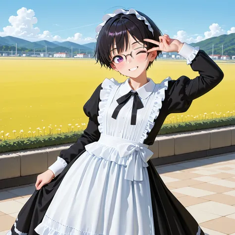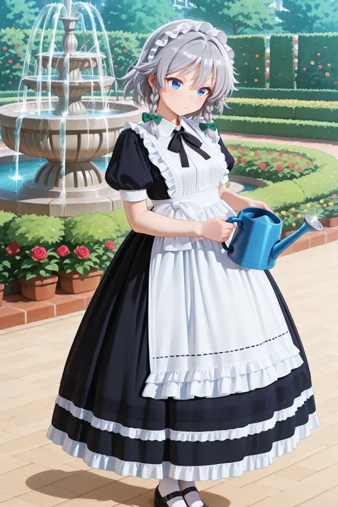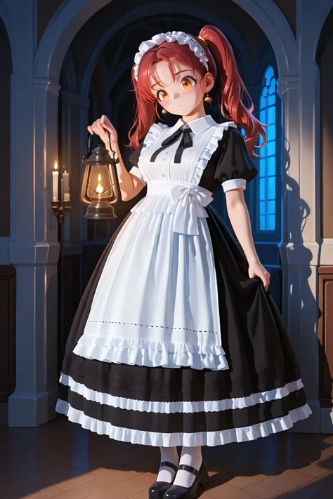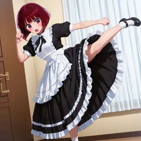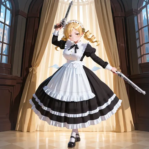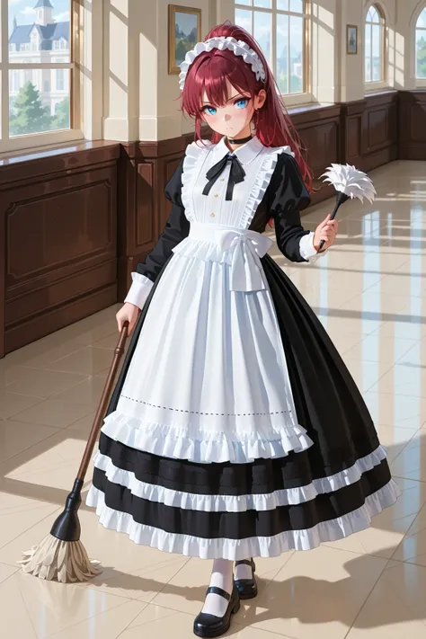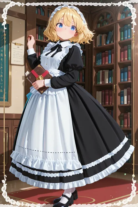 longmaid_dress,collared dress,frilled dress,long dress,puffy sleeves ,black dress ,frilled apron,black neck ribbon, frills , maid apron,,maid,(lace trim:1.3),white apron,maid headdress,mary janes,juliet sleeves,short sleeves,