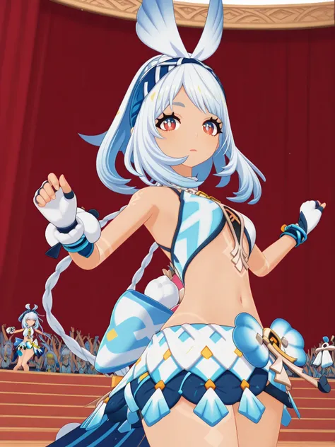 mualani, mualani (genshin impact), long hair, red eyes, white hair, braid, tan, dark-skin, dark-skinned female, twin braids, hairband, mature female, small breasts, 3dskirt, gloves, bow, navel, bare shoulders, midriff, crop top, fingerless gloves,