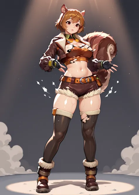squirrel girl, squirrel tail, squirrel ears, brown hair, brown jacket, animal ears, black stockings, brown boots, fur boots, brown top, crop top,
