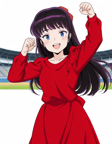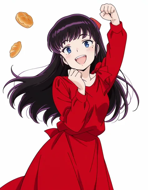 ryouko mendou, long hair, blue eyes, purple hair, bow, hair bow, mole, mole under eye, mature female, small breasts, anime screencapskirt, serafuku, shirt, black shirt, white sailor collar, long sleeves, black skirt, neckerchief, white neckerchief,dress, red dress, collarbone, long sleeves,