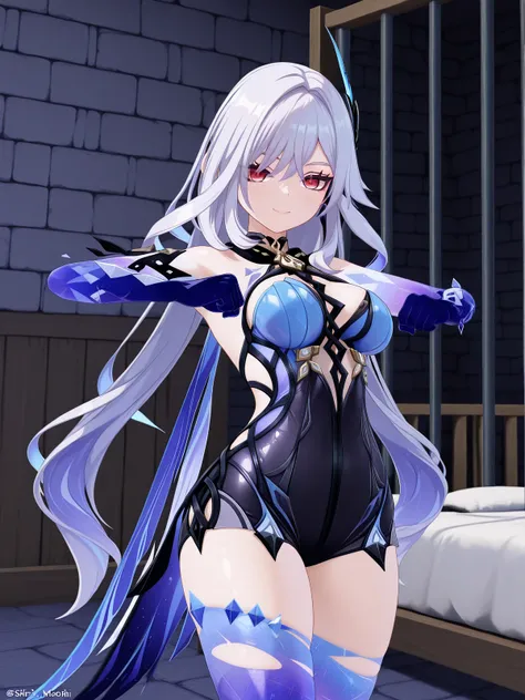 skirk, skirt (genshin impact), long hair, bangs, hair ornament, hair between eyes, very long hair, red eyes, white hair, mature female, breasts, 3dgloves, dress, cleavage, bare shoulders, elbow gloves, white dressthighhighs, gloves, bare shoulders, black gloves, elbow gloves, leotard, clothing cutout, black leotard, two-tone leotard, blue leotard, blue thighhighs, torn clothes, coattails, zettai ryouiki,