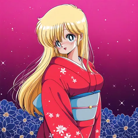 anime coloring,retro artstyle,1980s (style), nakamura_yuka\(1+2=paradise\),1girl,blonde hair,long hair,blue eyes,lips, large breasts,blue sailor color,white shirt,red_neckerchief,long_sleeves, blue skirt,pleated_skirt,white socks,uwabaki,negligee,see-through costume,sleeveless,