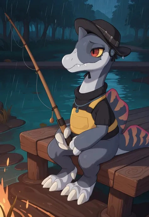 Ezra, female, spinosaur, gray skin, red eyes, 3 fingers, 3 toes, yellow vest, black sweater,fishing hat,
