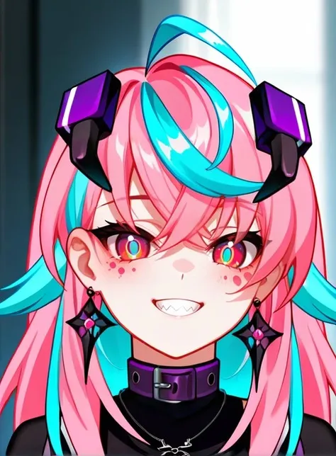 Emikukis,pink freckless, red eyes, multicolored eyes, pink hair, blue hair, two-tone hair, long hair, streaked hair, sidelocks, hair between eyes, bangs, ahoge, horns, earrings, medium breasts